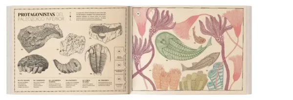 Contiene páginas vegetales con ilustraciones de la fauna y la flora protagonistas del Paleozoico y del Mesozoico. Una línea de tiempo sitúa en todo momento al lector en el punto de la historia de la Tierra en el que se encuentra.