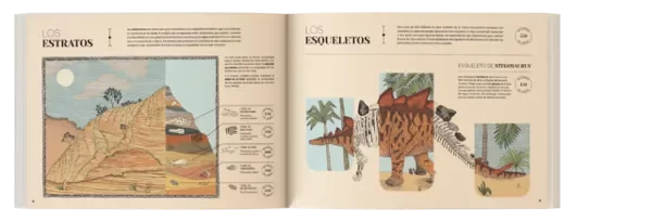 Solapas de cartón para interactuar con las páginas descubriendo los fósiles de algunos animales que existieron hace millones de años.