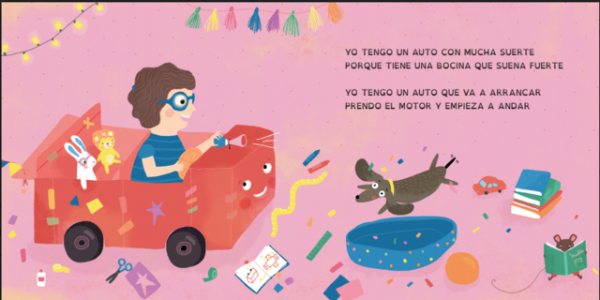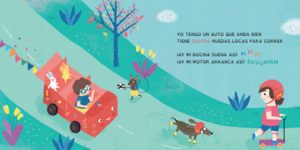 "Yo tengo un auto/con mucha suerte/ porque tiene una bocina/ que suena fuerte". Este Libro-Canción de Vuelta Canela cuenta la historia de un auto que va perdiendo sus ruedas. Por medio del juego y la imaginación, este grupo de amigos y amigas va encontrando la forma de arreglarlo. Este libro también nos muestra los números mientras cantamos y contamos una divertida canción.