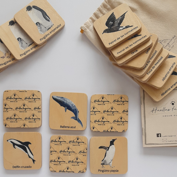 Memotest de madera con imágenes de animales de la Antártida Argentina. En la parte A tiene 20 fichas de madera con 10 especies y en Memotest Antártida parte B tiene 10 especies distintas, así podés complementarlo y armar un juego de 40 fichas.