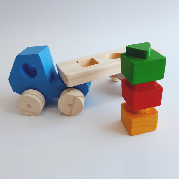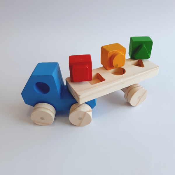 El Camión de madera, cuidadosamente terminado, tiene 3 figuras con opción de encastre o sellos, es desarmable y sus ruedas giran.