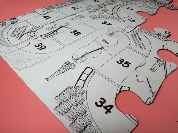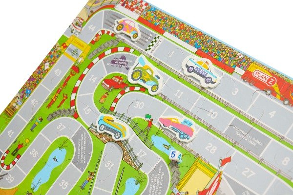 Lo armás, luego con los dados y los autos jugás a las carreras y después lo das vuelta y pintas