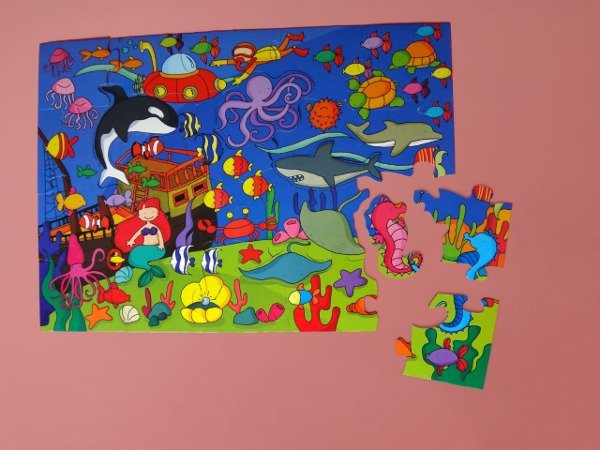 Incluye 28 piezas de cartón extra gruesas. 2 niveles de dificultad con 8 piezas enteras (tiburón, pulpo, sirenita, caballito de mar, raya, cangrejo, ballena y tortuga)