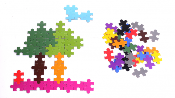 Rompecabezas de 150 piezas en 12 colores reversibles. Todas las fichas encastran con todas permitiendo crear diseños propios