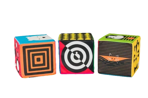 Cubo de 14x14x14 cm, con figuras de estimulación sensorial, fabricados en jersey de seda estampada, con sonidito